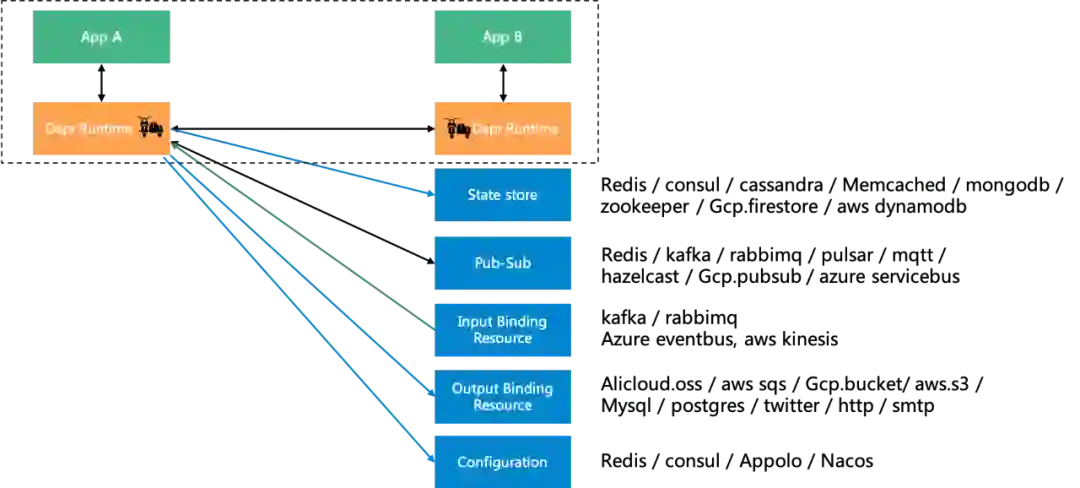 ServiceMesh 关注于服务间通讯,即下图中虚线部分;而 Dapr 除了服务间通讯之外,还适用于诸多其他的场景,如状态存储、消息的发布订阅、资源绑定、配置等。