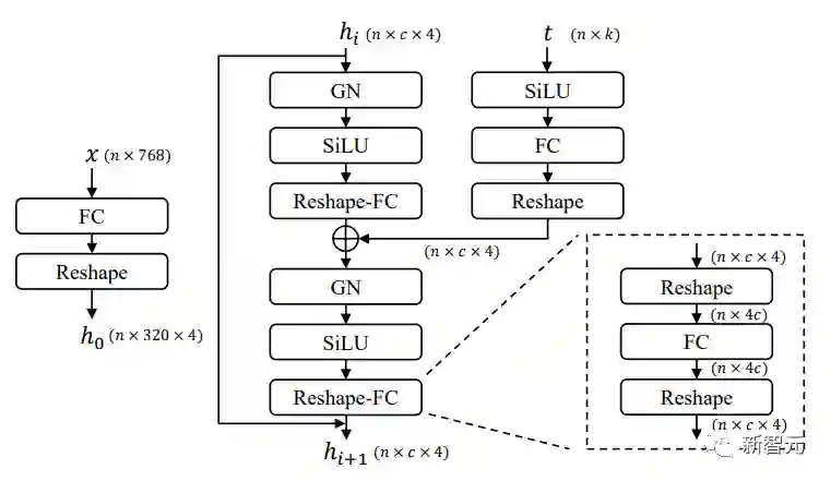 如上图所示,FCResBlock包含两组全连接层(FC)、分组归一化(GN)和sigmoid线性单元(SiLU)。x是输入文本潜伏代码,t是输入时间嵌入,hi是中间特征。