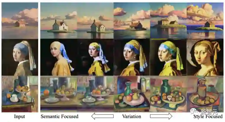 在下图中,作者首先生成输入图像的变体,然后以语义(左边)或风格(右边)为重点对其进行操作。