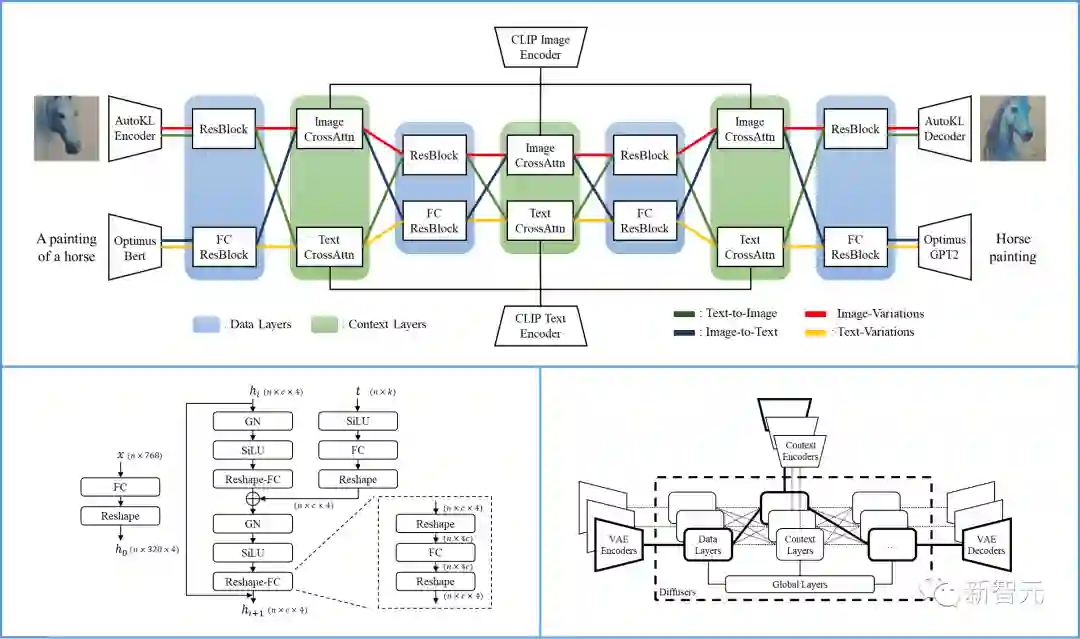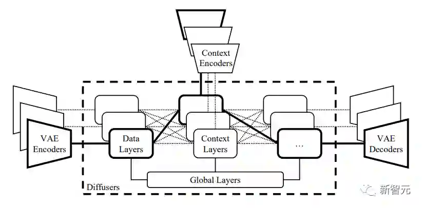 研究人员基于Versatile Diffusion,进一步提出了一个通用的多流多模态框架,其中包括VAE、上下文编码器和包含三层(即全局、数据和语境层)的diffuser。