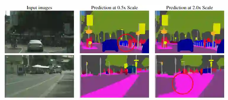 在第一行中,细杆在缩小(0.5x)图像中被不一致地分割,但在放大(2.0x)图像中得到更好的预测。在第二行中,较大的道路/分隔线区域以较低的分辨率(0.5x)进行了更好的分割。