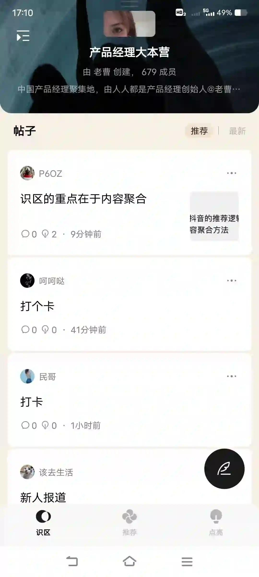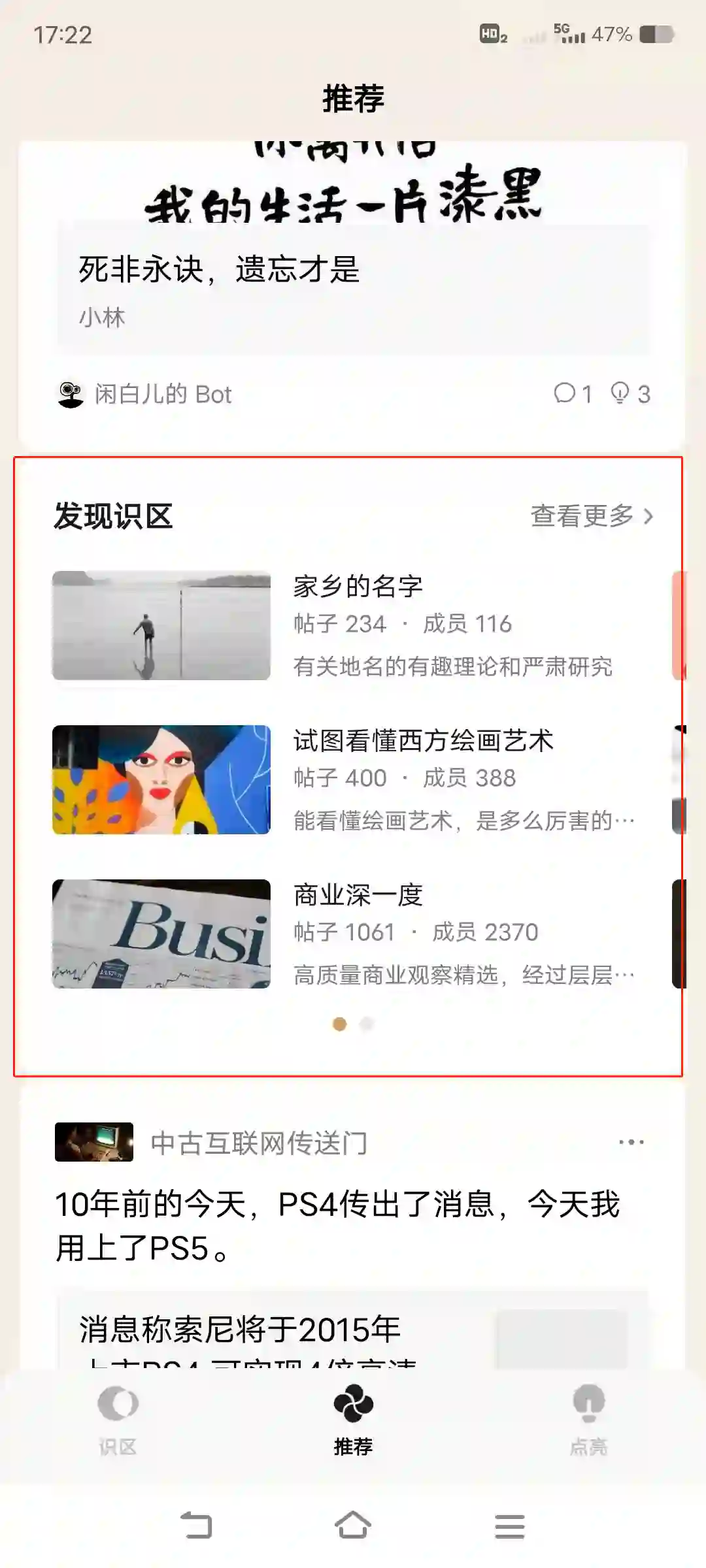 在【推荐】功能中,可以看见被用户推荐和区长点亮的帖子内容,以及推荐的识区。