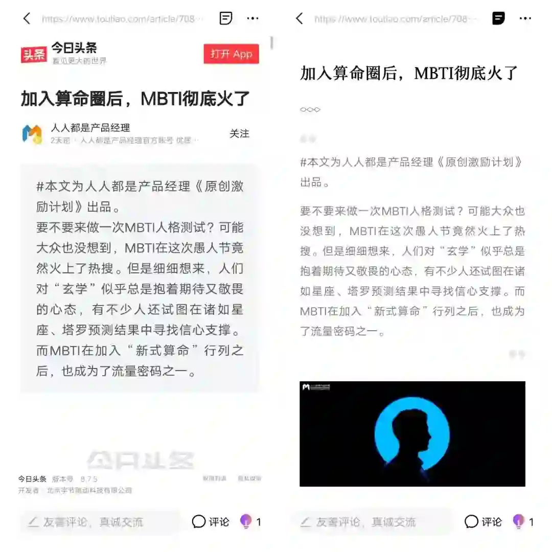 那么问题来了:既然同样都是今日头条的内容,我为什么不在今日头条阅读,反而要跑到另一个产品来阅读它呢?