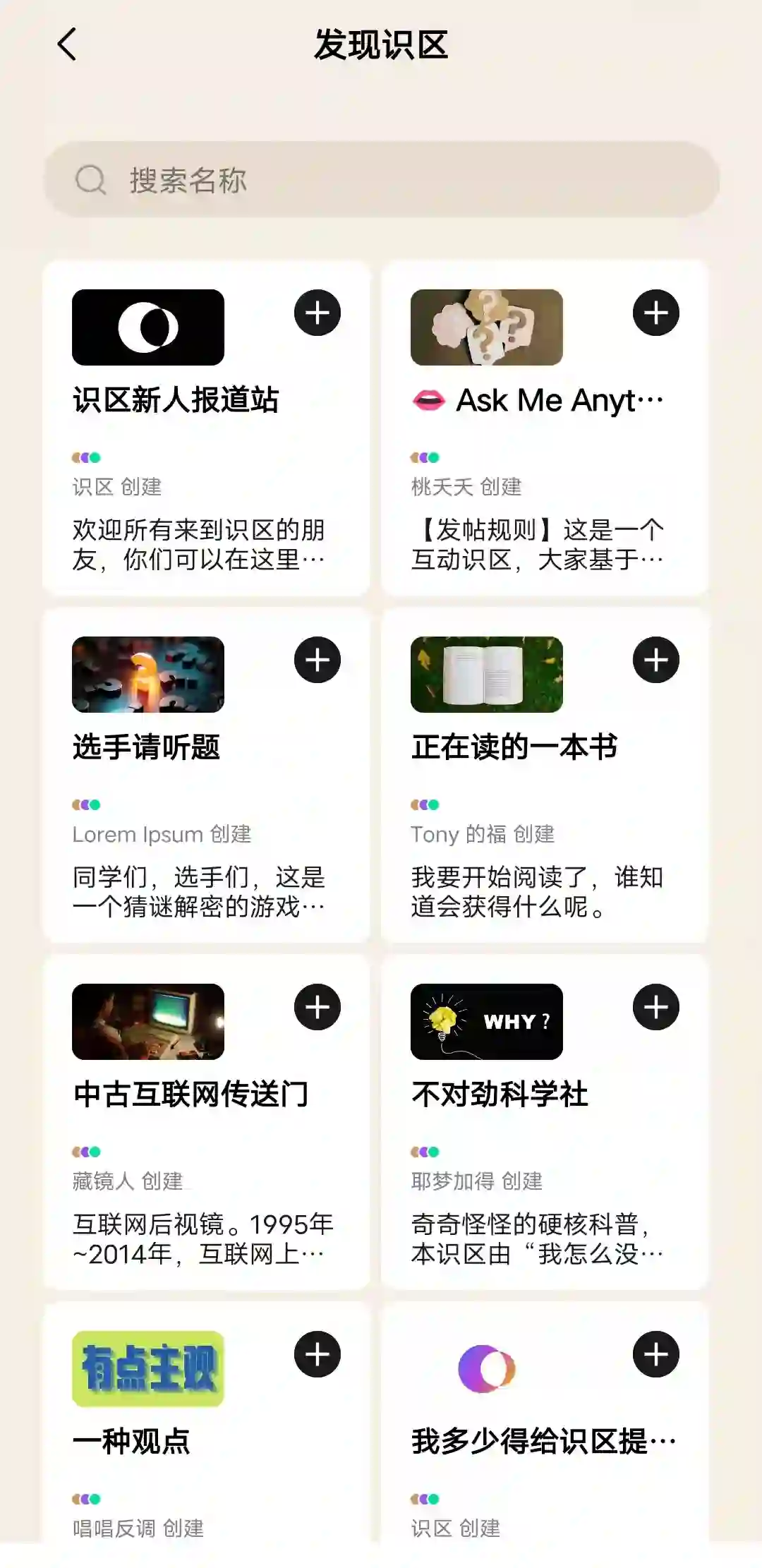 进入产品后,在左上角的【发现识区】,找到你喜欢的圈子加入。除了少部分官方识区外,大部分识区都是由个人用户创立,包含艺术、书籍、科技、生活等多个领域。