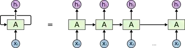 在上面的示例图中,左边代表一个RNN神经网络的模块,A 。它正在读取某个输入 x_i,并输出一个值 h_i。循环可以使得信息可以从当前步传递到下一步。