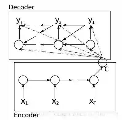 根据Cho et al.的论文,其中 Encoder 部分就是一个RNNCell (RNN, LSTM, GRU, etc.)。如下图,每个 timestep, 我们向 Encoder 中输入一个词向量,直到句子的最后一个输入X_T。然后,Encoder 输出整个句子的语义向量 c(一般 c=h(X_T))。因为 RNN 的特点就是把前面每一步的输入信息都考虑进来了,理论上这个 c 就能够把整个句子的信息都包含了。
