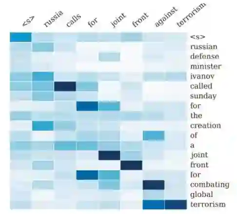 这个例子中,我们要总结长句子为短句子,而要尽可能的保留重要信息。Encoder-Decoder框架的输入句子是:“russian defense minister ivanov called sunday for the creation of a joint front for combating global terrorism”。对应图中纵坐标的句子。系统生成的摘要句子是:“russia calls for joint front against terrorism”,对应图中横坐标的句子。可以看出模型已经把句子主体部分正确地抽出来了。矩阵中每一列代表生成的目标单词对应输入句子每个单词的AM分配概率,颜色越深代表分配到的概率越大。