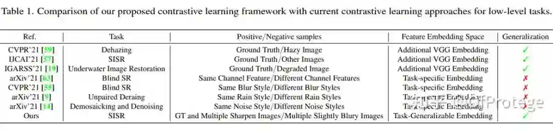 这些方法均存在一定的缺陷。[19, 57, 59] 将 gt 作为正样本,退化的图像或数据集中其余图像作为负样本。这些负样本与重建图像相似度低,导致容易区分,难以对对比损失做出贡献。而对一些特定的图像重建任务,另一些基于对比学习研究 [9, 14, 55, 63] 致力于生成图像的全局不变特征,免于噪声、雨、分辨率以及模糊。这些方法忽视了构建有效正负样本对这一部分。此外由于这些方法的对比损失定义在某些特定特征空间内,无法很好泛化至其他任务。