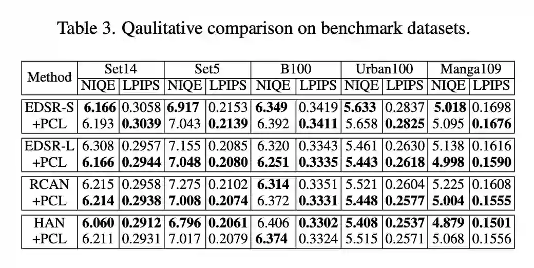3. 额外实验证明本文的方法(PCL-SISR)表现在定量与定性方面均优于代表性的 SISR 方法。