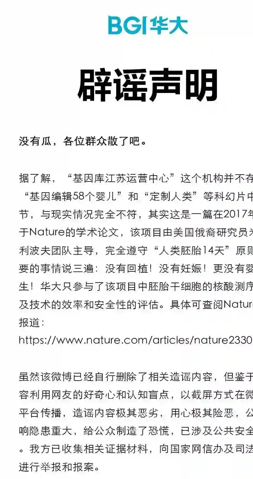 【华大基因辟谣基因编辑婴儿传闻 :“基因库江苏运营中心”不存在,已报案】针对网传“华大基因编辑58个婴儿”一事,华大基因官微发声明称,“基因库江苏运营中心”不存在,“基因编辑58个婴儿”和“定制人类”等与现实情况完全不符,其系2017年发表于Nature的学术论文,项目由美国俄裔研究员米塔利波夫团队主导,完全遵守“人类胚胎14天”原则,没有回植、妊娠,更没有婴儿出生。