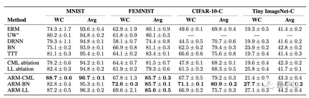 在4个不同图像分类基准上的比较结果显示,无论是在最坏情况(WC)还是在平均性能上,ARM方法都明显具更好的性能表现和鲁棒性。
