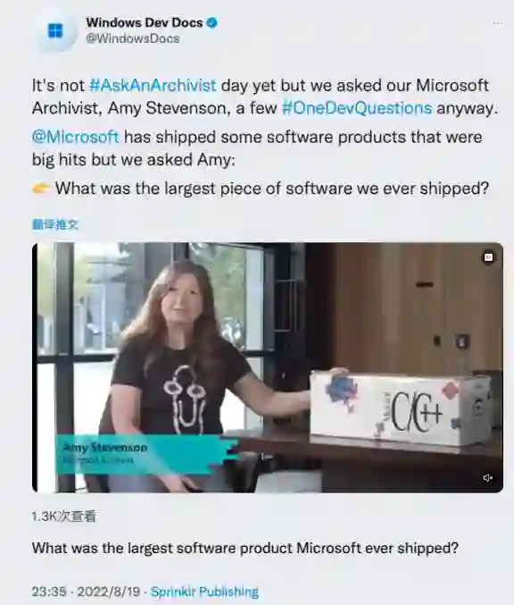 近日,在微软 Windows 开发者文档团队在 Twitter 上公开了内部对其公司档案专家 Amy Stevenson 的一则采访,当询问到关于“微软至今发行的最大软件是哪个?”时,对方给出了一个「带有 Windows SDK 的 Microsoft C/C++ 编译器」的答案。