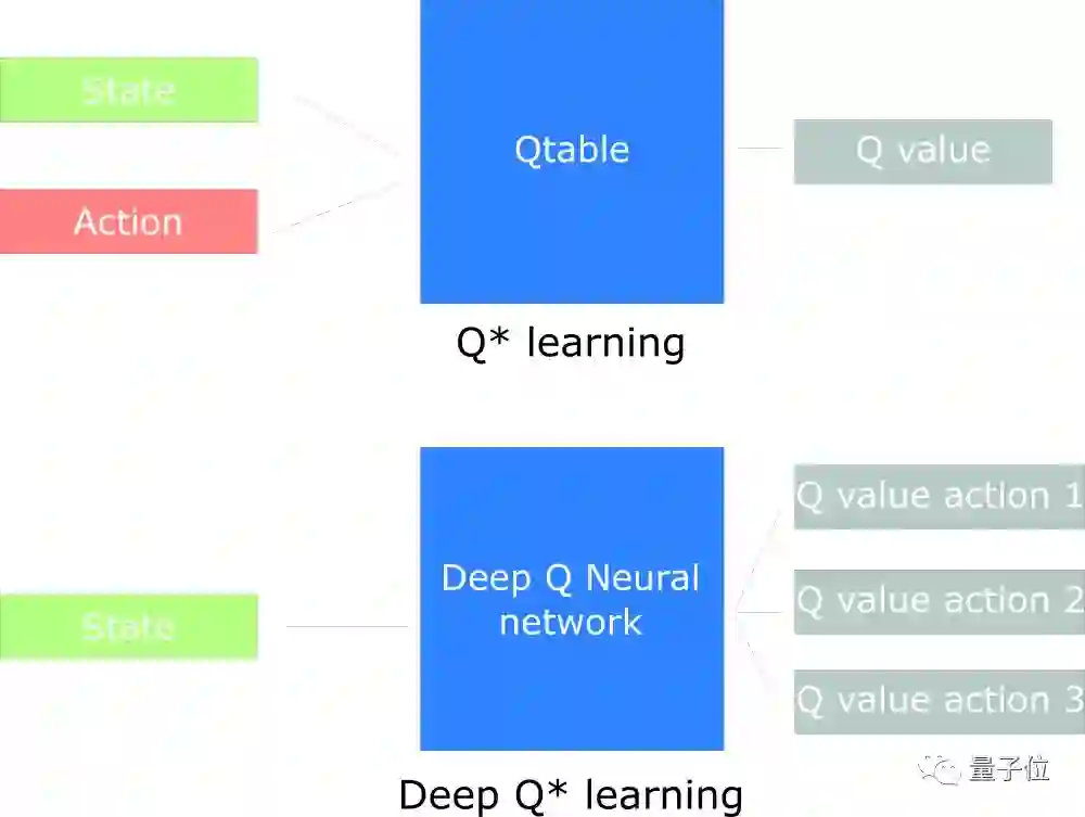 如图,拿Q学习和深度Q网络 (DQN) 来举例。
