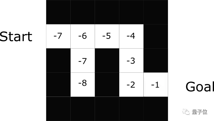 在迷宫问题中,每一步我们都选取最大函数值:-7,-6,-5,以此类推,达到目标。