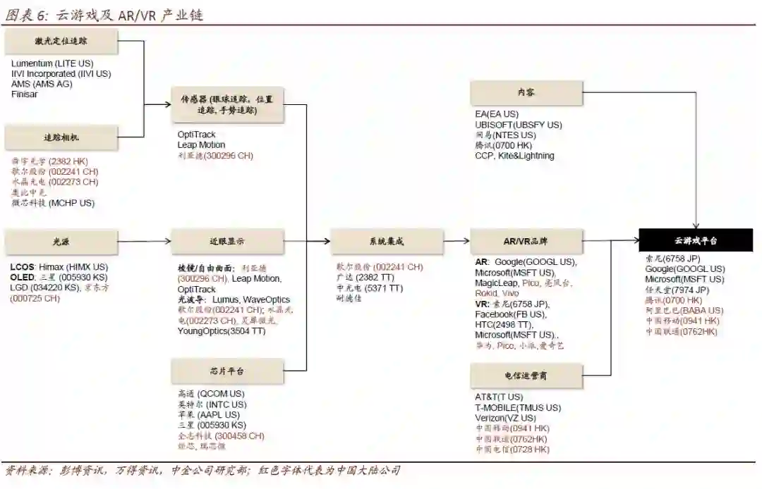 云游戏与AR/VR等新一代智能硬件结合,可能成为5G时代的第一个杀手级应用。AR/VR近眼显示光学方案、AR/VR芯片平台、追踪相机与传感器等产业链核心环节投资价值凸显。