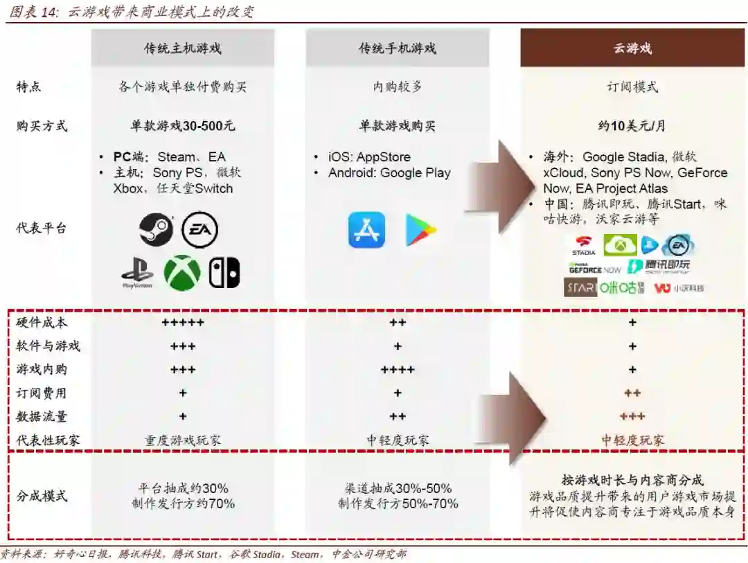 我们判断未来网络运营商将与内容商合作共赢,通过订阅模式下以游戏时长分成的商业模式共同扩大中轻度游戏市场规模(类似数字音乐由下载转为订阅模式后,市场规模大幅提高)。