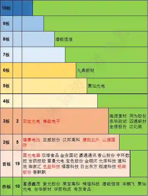 图中标的剔除新股和ST,绿色背景为炸板或进阶失败个股,其他颜色背景为对应高度涨停个股。红色字体为主观选择的对应高度核心股,每个高度不超过三只,便于观察市场情绪变化和结构走向,非投资建议。