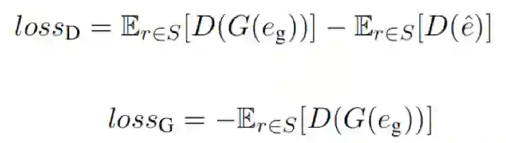 适配器 G(·) 在 GaN 中充当生成器。对于从训练集取样的任何关系,鉴别器的损耗lossD和生成器损耗lossG的目标函数是:
