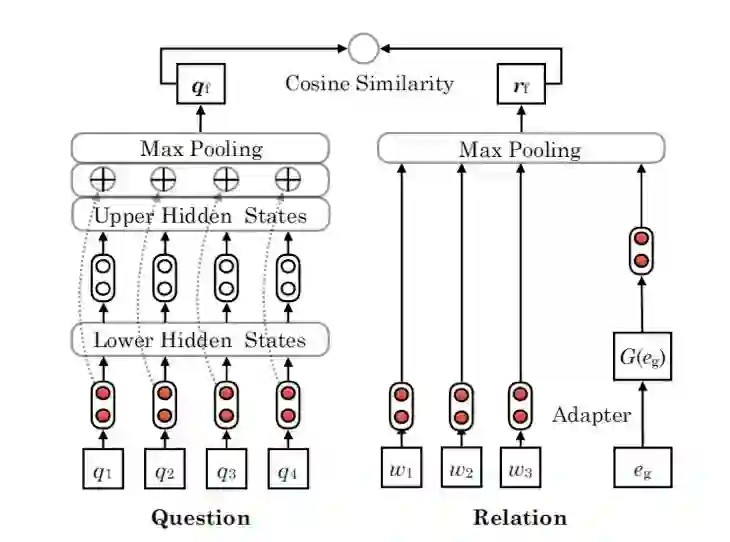 该框架使用问题网络将问题句编码为矢量 qf,使用关系网络将关系编码为矢量rf。这两个网络都是基于Bi-LSTM和最大池化操作。然后引入余弦相似度来计算qf与rf之间的距离,从而确定检测结果。论文提出的适配器是关系网络中用来增强该框架的一个附加模块,如下图所示: