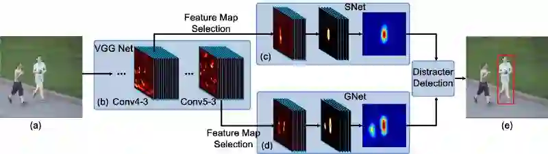 由于这些观察,FCNT设计了特征选择网络,以在VGG网络的conv4-3和conv5-3层上选择最相关的特征图。然后,为了避免在噪声上过拟合,它还分别为两个层的选定特征图设计了额外的两个通道(称为SNet和GNet)。GNet捕获目标的类别信息,而SNet将目标位置为中心的感兴趣区域(ROI)。最后,通过SNet和GNet,分类器获得两个预测热图,并且跟踪器根据是否存在干扰者来决定将使用哪个热图来生成最终跟踪结果。FCNT的流程如下所示。