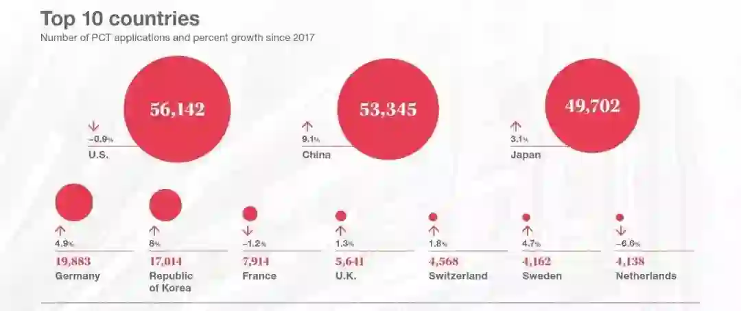 最好的一个证明就是含金量相对较高的PCT国际专利申请量,2018年中国共有53345件PCT国际专利申请,仅次于美国的56142件。更可怕的是增速,9.1%的增速为前十国家中最高,预计在今明两年内就会超过美国。此外,中国高校也首次进入全球高校的PCT专利申请量前十,占据了四席。