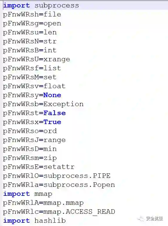 解码后得到病毒的Python代码,代码中的关键字符串也进行了混淆。