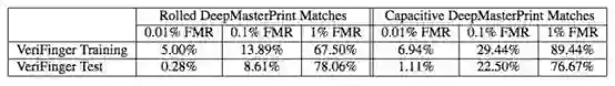 表 1:在电容式指纹数据集上的成功匹配结果。图 4 中的 DeepMasterPrints 是为 VeriFinger 软件而优化的,有三种安全级别,训练数据集是电容式指纹数据集。每种 DeepMasterPrints 在测试集上的有效性见上表。
