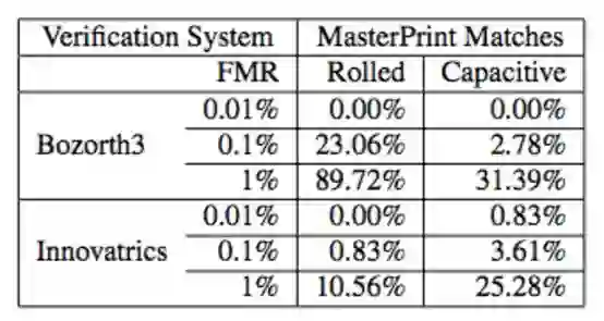指纹被越来越多地用于核实个人身份,其应用范围非常广泛,包括门锁解锁、手机解锁、授权付款等。出于人体工程学方面的考量,手机解锁等应用中的指纹传感器非常小,因此,这些传感器只获取用户指纹的部分图像。由于一小部分指纹的辨识度低于完整指纹,因此(一个手指上的)部分指纹与(另一个手指上的)部分指纹错误匹配的几率更高。Roy 等人在论文《MasterPrint: Exploring the Vulnerability of Partial Fingerprint-Based Authentication Systems》中利用该观察引入了 MasterPrints 的概念。MasterPrints 是一组真实或合成的指纹,可能和大量其他指纹意外重合。因此,对手可以利用它们启动一个针对特定主体(subject)的字典攻击,从而破坏指纹识别系统的安全性。也就是说,在不获取任何主体指纹相关信息的情况下「伪造」该主体指纹是可以实现的。