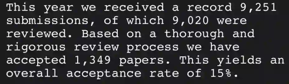 昨晚,投稿结果终于出炉。但令人意外的是,今年的接收率只有 15%(投稿量:9215;审稿量:9020;接收量:1349)。