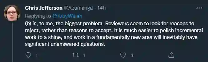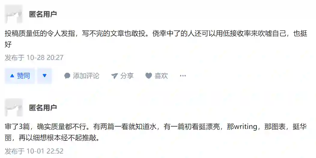 有人认为,这么低的接收率对整个社区是有害的,会迫使大家转向其他领域,去做一些渐进式的工作,因为这类工作比较容易润色。相比之下,NeurIPS 26% 的接收率要显得合理得多。