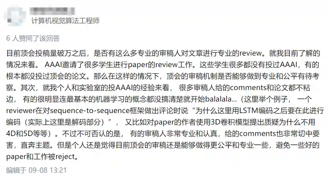 除了接收率,审稿质量也是一大槽点,比如邀请没有投过 AAAI 的学生当审稿人,审稿人给的评论和论文不沾边等。当然,这已经是个老生常谈的问题了,但组委会似乎一直没找到什么合适的解决办法。
