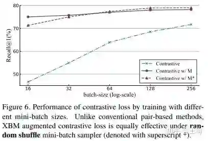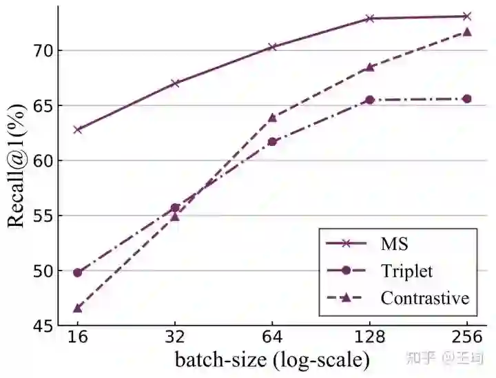 我们在三个标准图像检索数据库上,对于三种标准的pair-based方法,发现随着mini-batch变大,效果(Recall@1)大幅提升。实验结果如下: