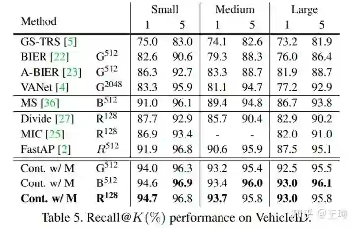 与最近的深度度量学习方法对比,我们在四个较大的检索数据库上,效果均大幅提升,这里仅列出在 VehicleID数据的效果,其他数据集的结果对比参见论文。