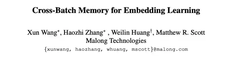 2. 其实Memory机制并不是本文原创,但是用Memory来做深度度量学习的难例挖掘,据我所知,我们是第一个。同时期的CVPR-2020由FAIR团队(何恺明等)提出的MoCo也是这种思路,虽然恺明把他的方法称为动态字典。本文的方法是MoCo在m=0的特例,恺明通过动量更新key encoder,可以直接控制住特征偏移。我们认为,这种方法还会在很多任务(比如few-shot learning等)带来较大的性能提升,不局限于MoCo的自监督学习和XBM的度量学习(或者称为监督表示学习)。
