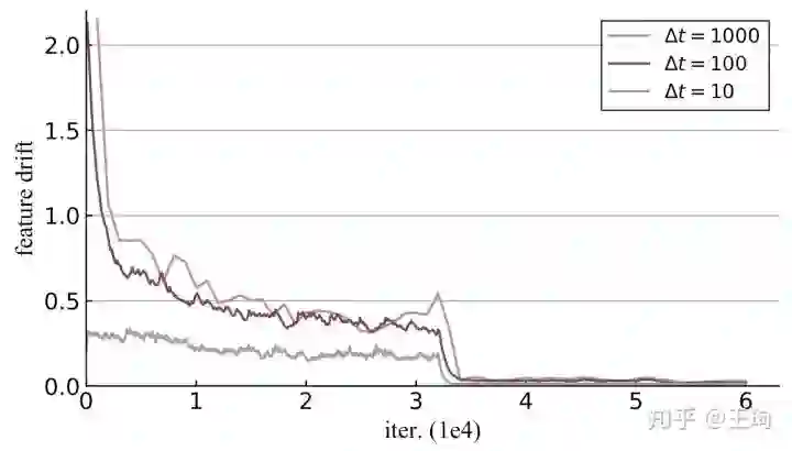 这时候有小朋友就又会问了,过去的mini-batch的特征是由过去的模型提取出来的,而模型在训练过程中是一直更新迭代的,那么过去的样本特征,如果用现在的模型提取,其实是不一样的。但是,不一样并不代表一定不行。关键点是有多不一样,与其猜测,不如去测试看看。我们观察样本特征随着模型训练的偏移量,称之为feature drift(特征偏移),精确定义参见原论文(原论文链接)。