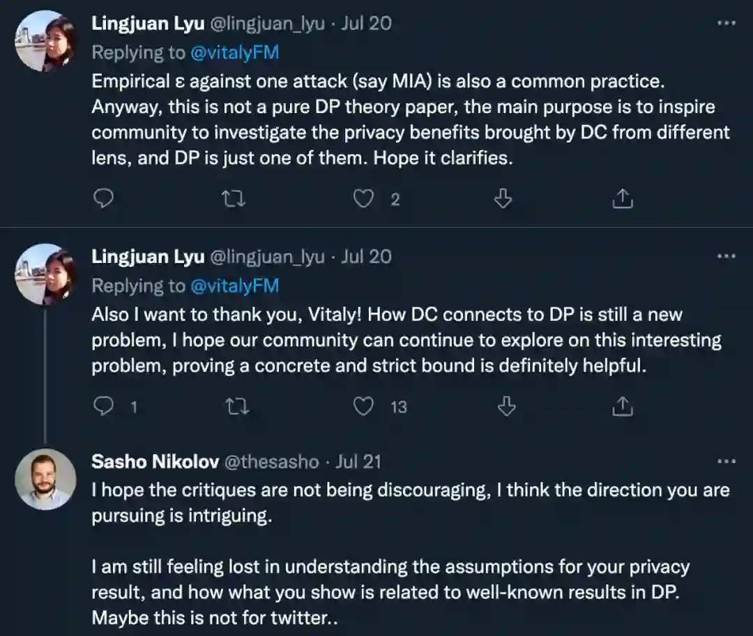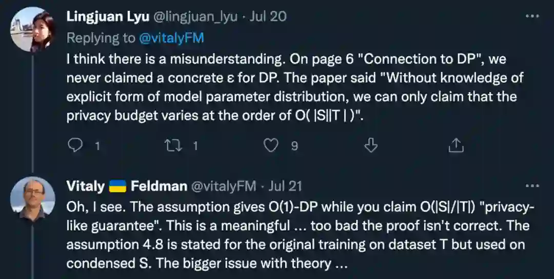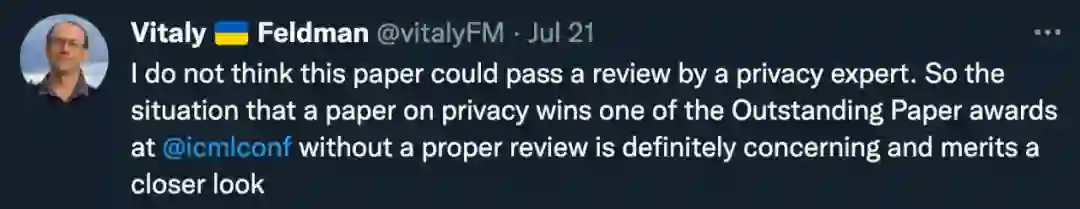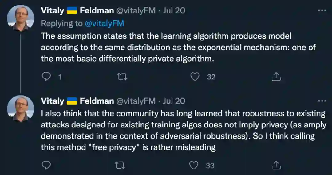 苹果研究科学家 Vitaly Feldman 的说法是:「(这篇论文)对隐私保证的分析毫无意义。作者显然没有意识到他们的(未经证实)的隐私保证的假设比他们所能证明的强大得多。」