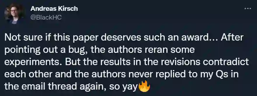 一次性评选出 15 篇杰出论文,这个不同于寻常的做法引起了研究者们的关注。与此同时,部分获奖论文的内容也在推特上引起了强烈的争议。