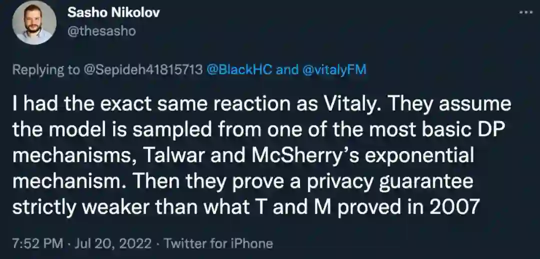 支持 Vitaly Feldman 观点的学者不在少数。多伦多大学副教授 Sasho Nikolov 认为:「他们假设模型是从最基本的 DP 机制之一(Talwar、 McSherry 2007 年的指数机制)中采样的,然后他们证明了一种比 Talwar、 McSherry 当年证明的还要弱的隐私保证。」