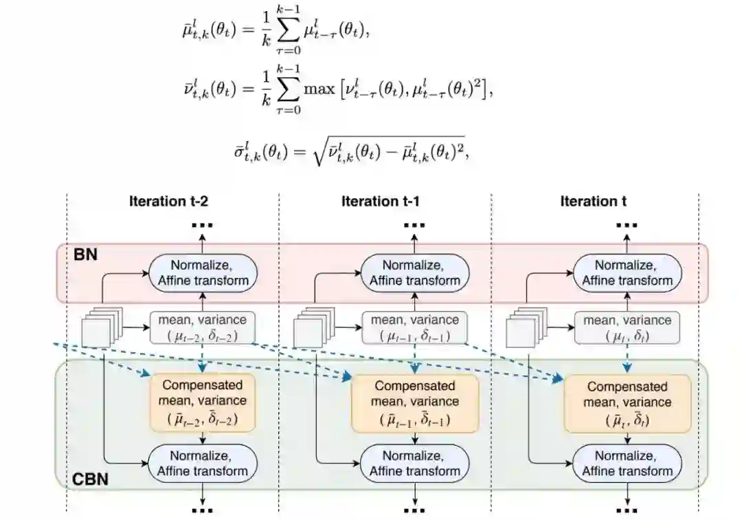 原始的批归一化会收集小批量数据内样本的均值和方差,以白化(whiten)层输入。但是,如果小批量数据规模很小,则这些估计结果将具有很高的噪声。一种解决方案是在许多小批量数据上估计它们。但是,由于每次迭代中权重都会变化,因此在这些权重下收集的统计数据可能会在新的权重下变得不准确。单纯地求平均可能出错。幸运的是,权重的改变是逐渐发生的。交叉迭代批归一化(CBM)使用了以下的调整来基于 k 个之前的迭代估计这些统计数据。