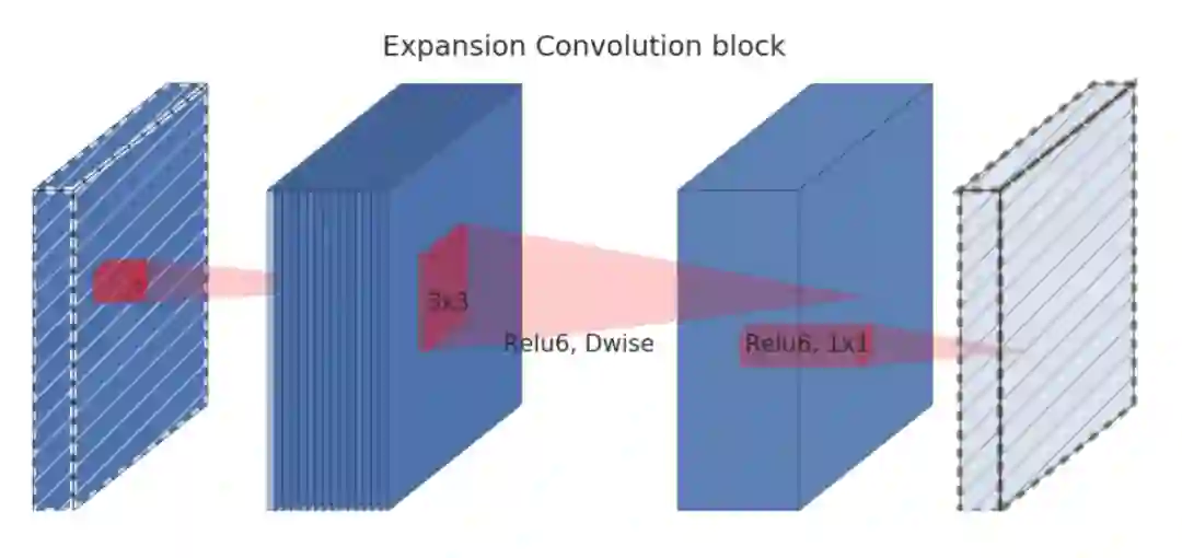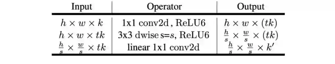 可以看到,低维表征首先被扩展到了 t_k 个通道。然后,使用轻量的 3 × 3 逐深度卷积对其进行过滤。在该模块的最后,特征又会被约减回低维。当其保持在高维空间中时,就加入非线性运算。