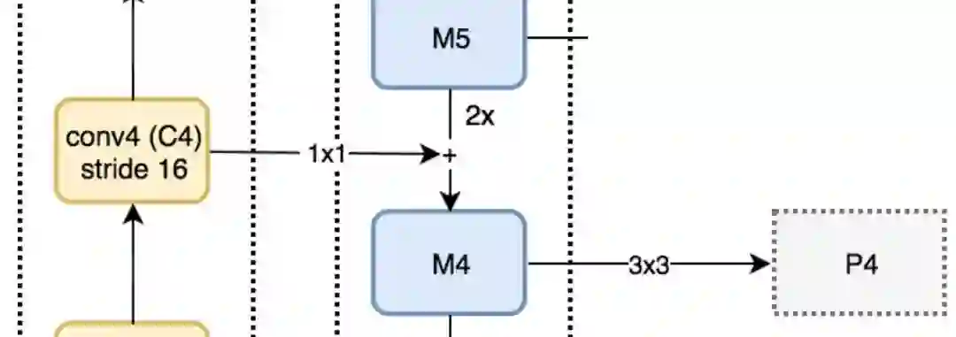 在针对特定尺寸大小进行预测时,FPN 会对自上而下的数据流进行上采样(2 倍),并将其与自底向上的相邻层相加(见下图)。得到的结果会被传递给一个 3×3 的卷积核,以减少上采样伪影以及为头部创建下图中的特征图 P4。