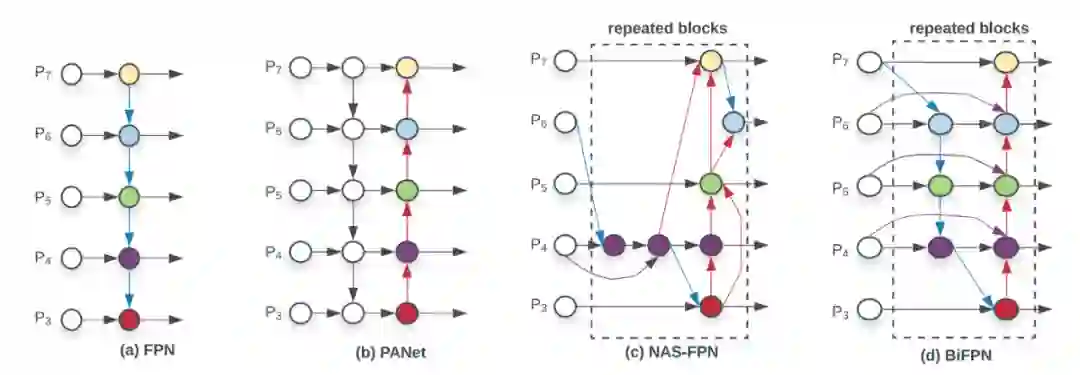 现在,更重要的是层的连接方式,尤其是目标检测器中层的连接方式。前面已经讨论过 FPN 和 PAN 示例。下图中的 d 展示了另一种颈部设计 BiFPN,其论文(arXiv:1911.09070)宣称 BiFPN 在准确度与效率的权衡方面表现更好。