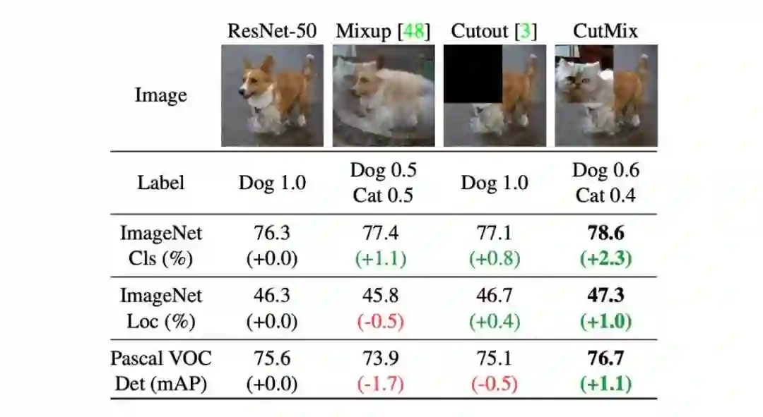 从概念上讲,CutMix 在目标的可能组成成分方面有更宽广的视角。裁减掉的部分会迫使模型学习使用不同的特征组合进行分类。这可避免信心过高。因为是用另一张图像替代该区域,所以图像中的信息量和训练效率都不会受到显著的影响。
