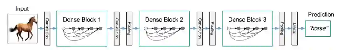 然后,通过组合多个密集模块与其间的过渡层(由卷积和池化构成),可以构建出 DenseNet。
