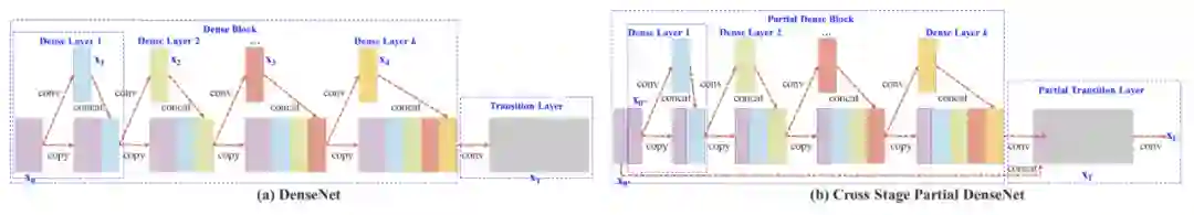 CSPNet 将密集模块的输入特征图分为了两部分。第一部分 x_₀’ 会绕过密集模块,成为下个过渡层的输入的一部分。第二部分 x_₀’’ 则会通过密集模块,如下图所示。