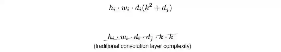 假设输入的维度为 hᵢ × wᵢ × dᵢ。则其会应用 dᵢ 个 k × k 的卷积过滤器——每个通道一个。然后其会为所有通道应用 1×1 卷积过滤器,得到大小为 hᵢ × wᵢ × dⱼ 的输出。因此,总计算复杂度为: