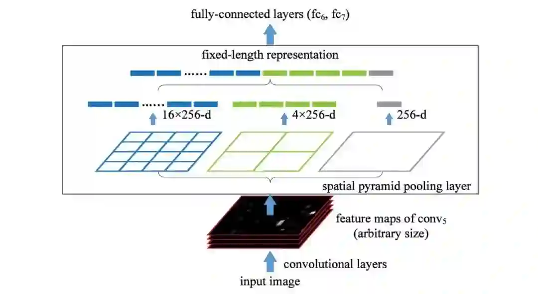 SPP 应用了略有不同的策略来检测不同尺寸大小的目标,即使用一个空间金字塔池化层替代了最后的池化层(在最后的卷积层之后)。其特征图在空间上分成了 m×m 个 bin,其中 m 可以分别为 1、2、4 等值。然后针对每个通道,为每个 bin 应用一次最大池化。这会形成一个长度固定的表征,然后可以使用 FC 层对该表征进行进一步的分析。