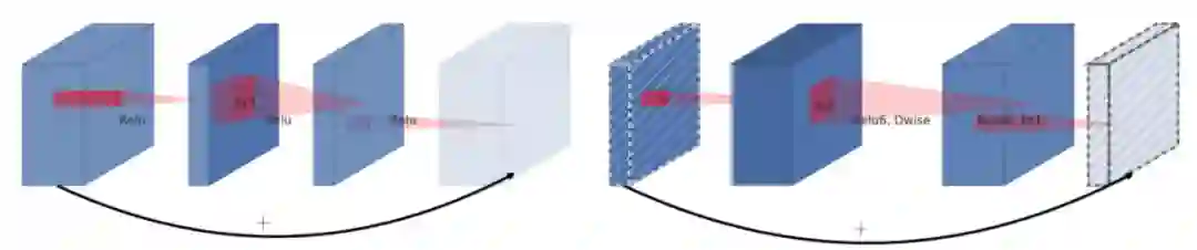 该模块的起始处和终点之间添加了一个残差连接。下面左图是传统的残差模块,右图是这里描述的反向残差模块。